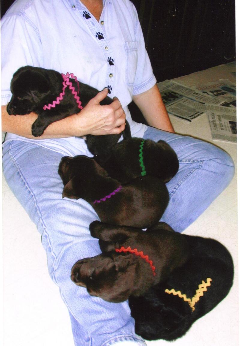 Trouble (pink) as a pup with her litter mates, zonked out after playtime.